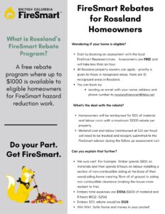 Applying is easy! send an email to rosslandfiresmart@telus.net – provide your address and contact details and we’ll contact you – thank you! Download a copy of the FireSmart Rebate Program Information shown above.
