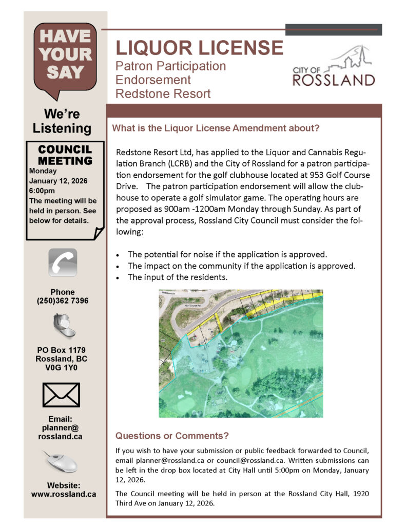 Redstone Resort Ltd. has applied for a patron participation endorsement for the clubhouse to operate a golf simulator game. See attached notice for more information.
