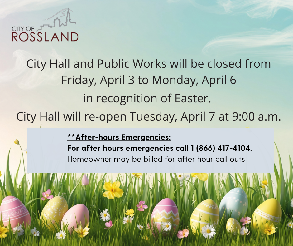 City Hall and Public Works will be closed Friday, April 3rd and Monday, April 6th, re-opening on Tuesday, April 7th