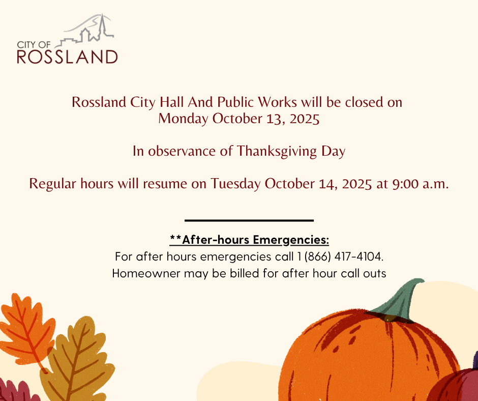 City Hall and Public Works will be closed in recognition of Thanksgiving Day on Monday, October 13, 2025. We wish everyone a safe and enjoyable long weekend! Regular operations will resume on Tuesday, October 14, 2025.