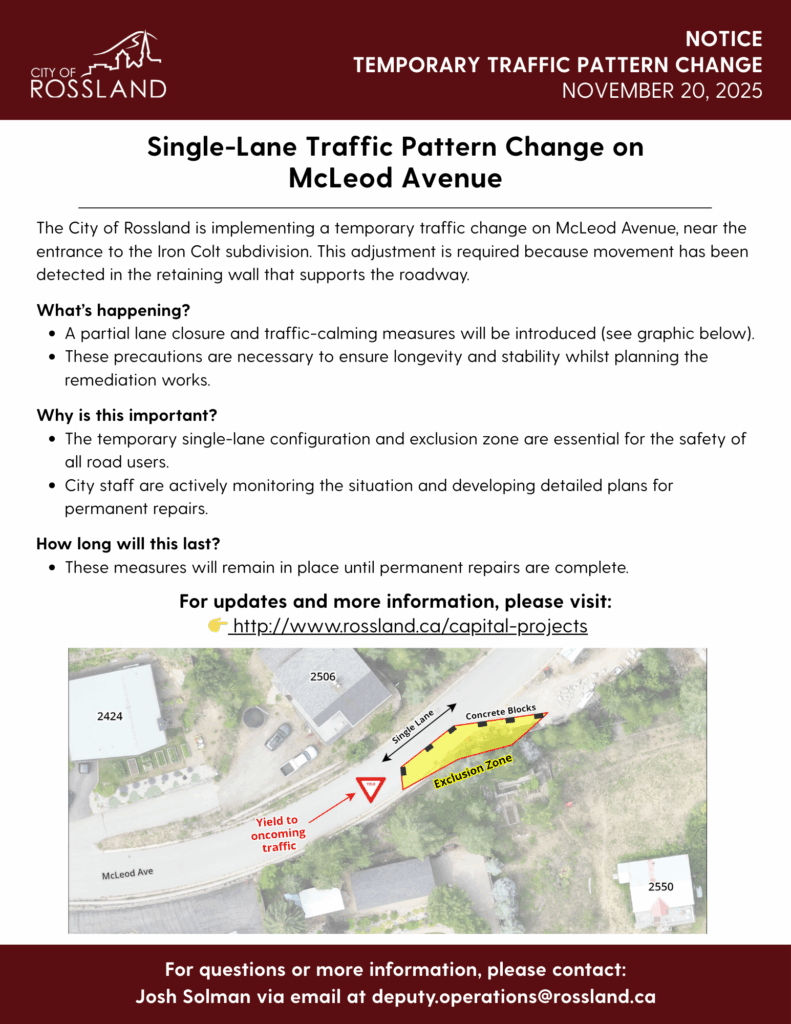 The City of Rossland is implementing a temporary traffic change on McLeod Avenue, near the entrance to the Iron Colt subdivision.