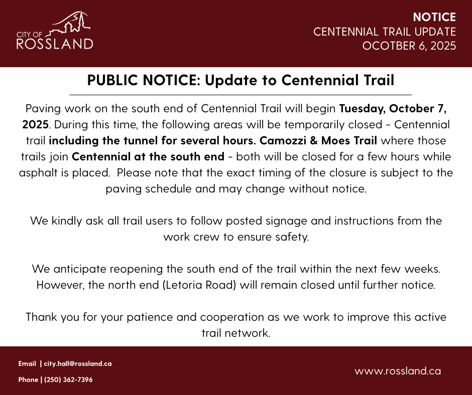 Paving work on the south end of Centennial Trail will begin Tuesday, October 7, 2025. During this time, the trail will be temporarily closed including the tunnel for several hours. Along with Camozzi & Moes Trails where the trail join Centennial at the South end – both will be closed for a few hours while asphalt is placed.