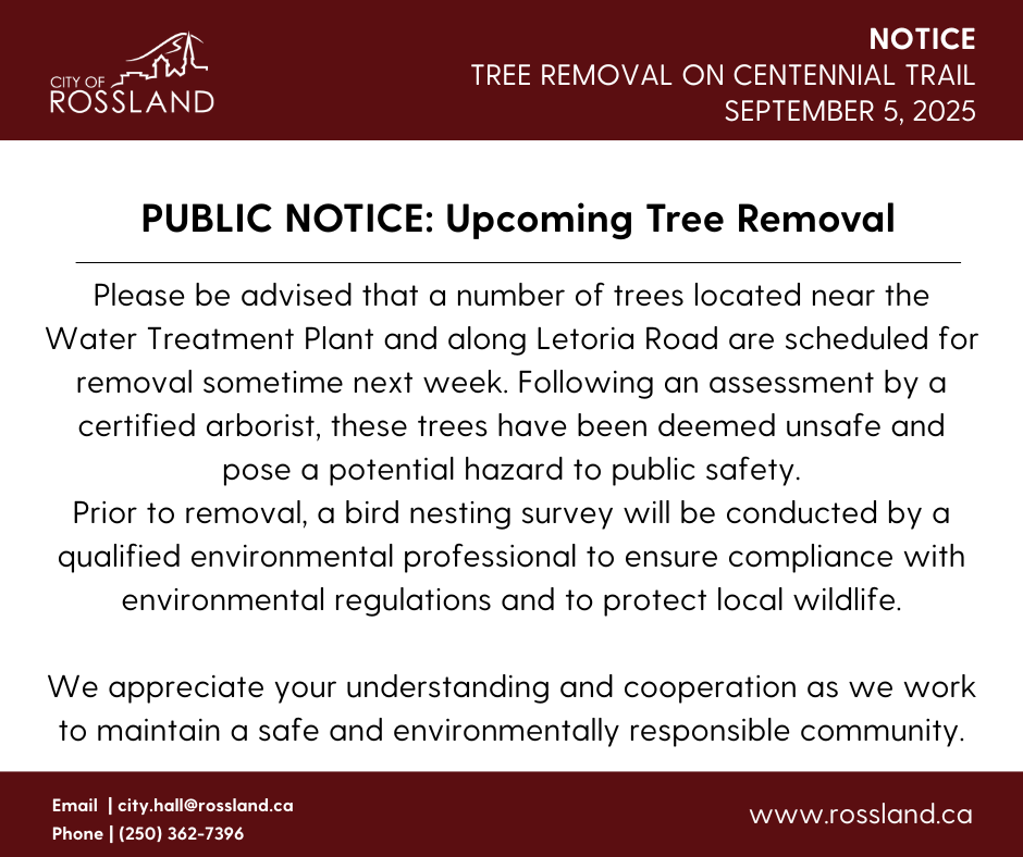 Please be advised that a number of trees located near the Water Treatment Plant (Centennial Trail) and along Letoria Road are scheduled for removal sometime next week.